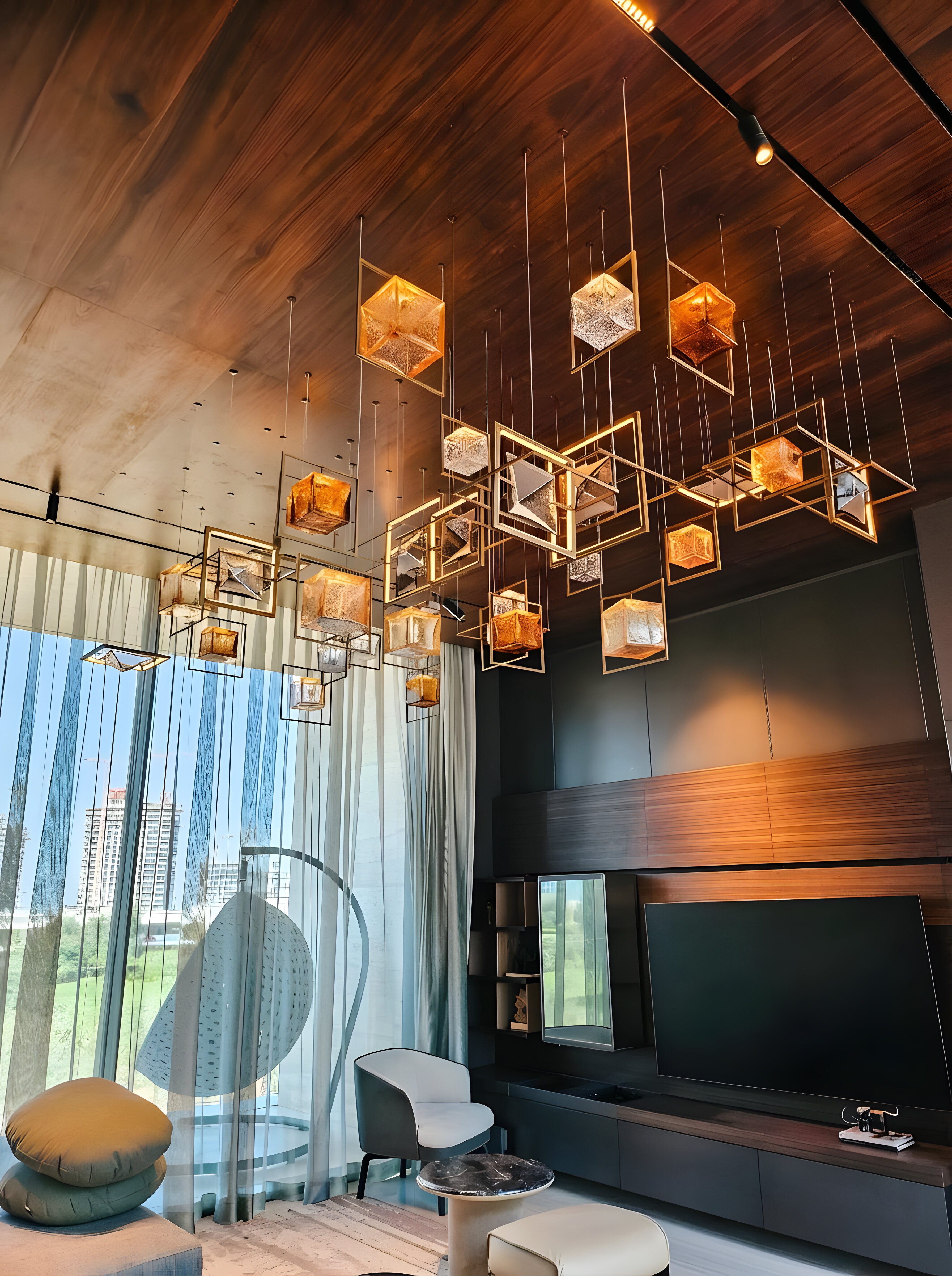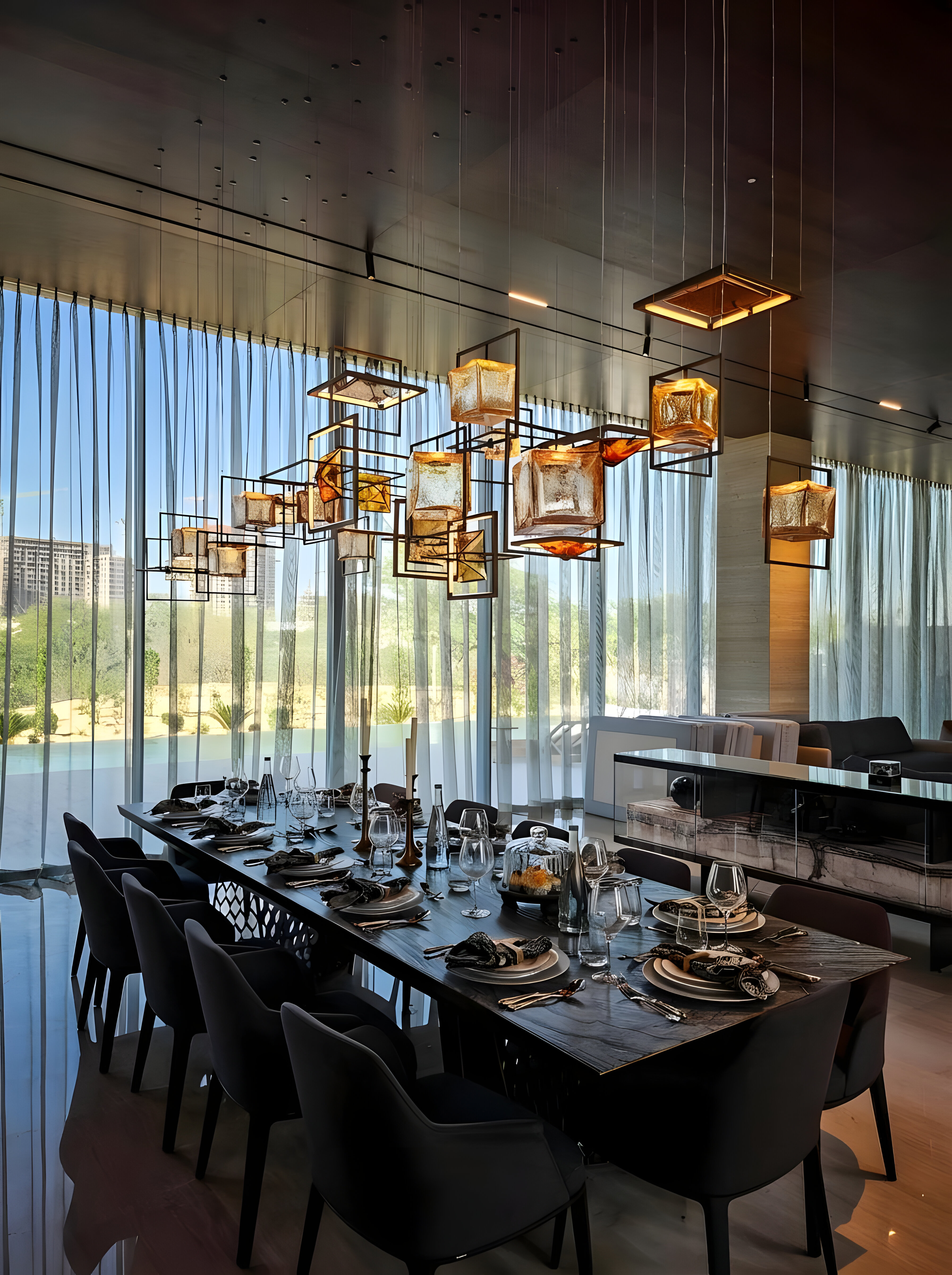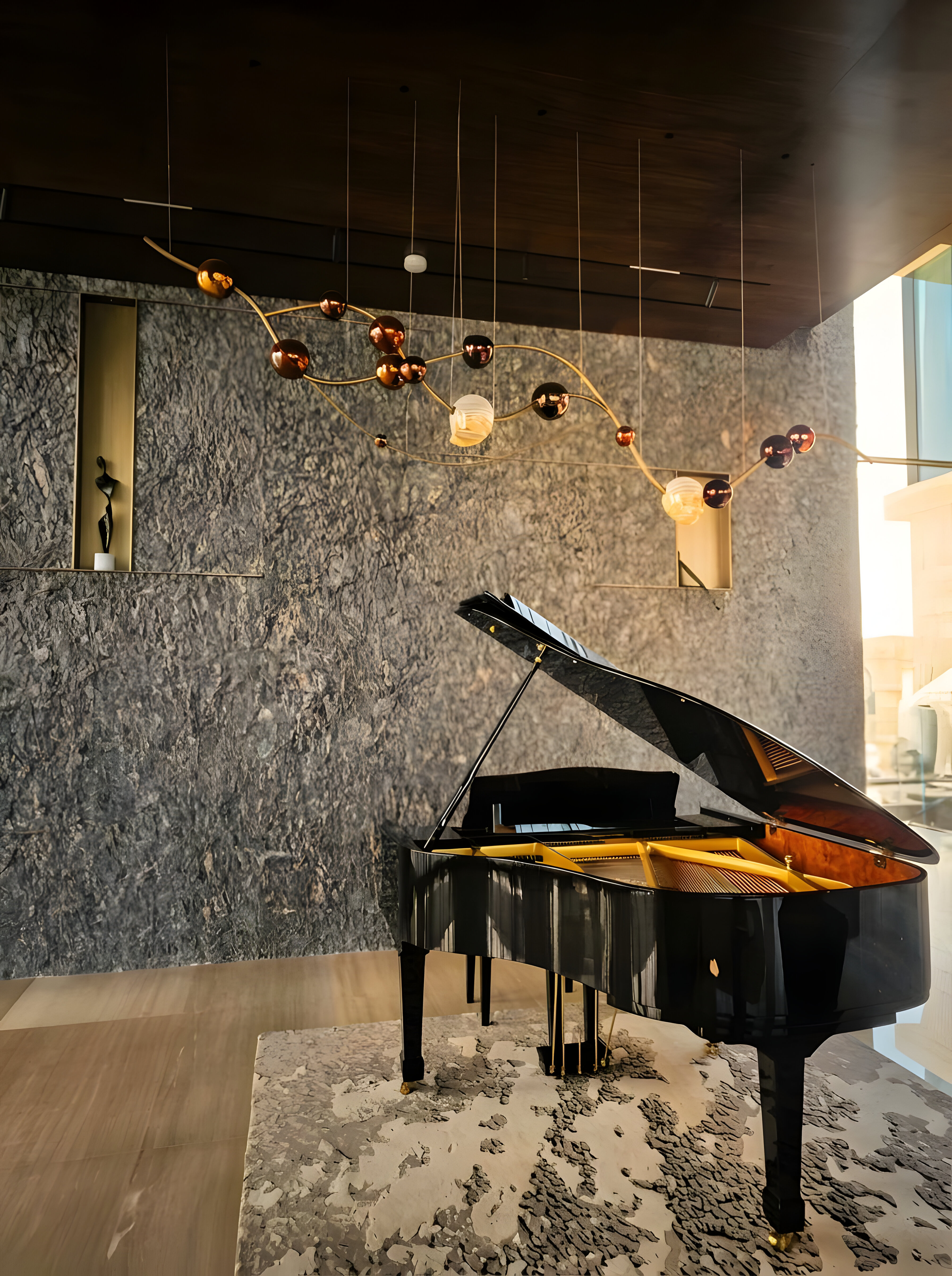 Developed through early dialogue with Mr. Emaad, the chandelier was created even before the space was built. Designed to complement the flow of light and reflection, it adds intimacy, softness, and a human scale to the architecture.